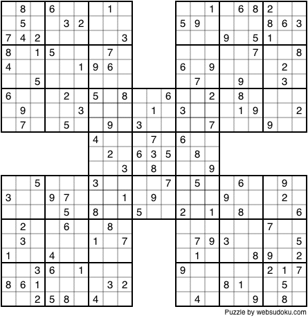 Instructions: Complete each of the five intersecting 9x9 puzzles just like a regular Sudoku.